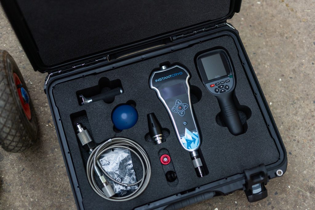 Mit INSTANTCRYO™ wird flüssiges CO2 bei -78 °C und 50 bar Druck punktgenau auf die betroffenen Stellen appliziert. Durch diese Kombination aus extremer Kälte und hohem Druck wird die Oberflächentemperatur der Haut innerhalb von Sekunden auf ein therapeutisches Niveau gesenkt. Dein Pferd kann sich während der Behandlung entspannen, ohne Stress und in ruhiger Atmosphäre.