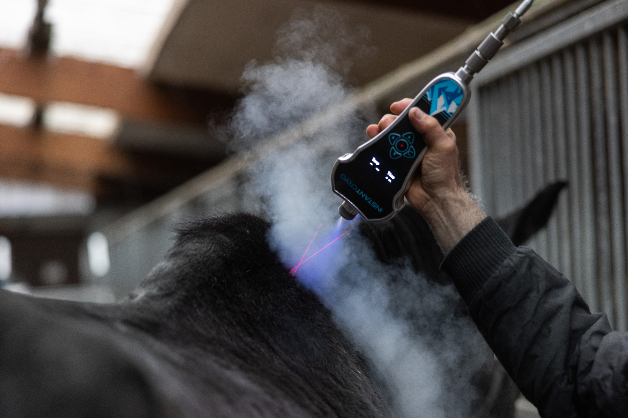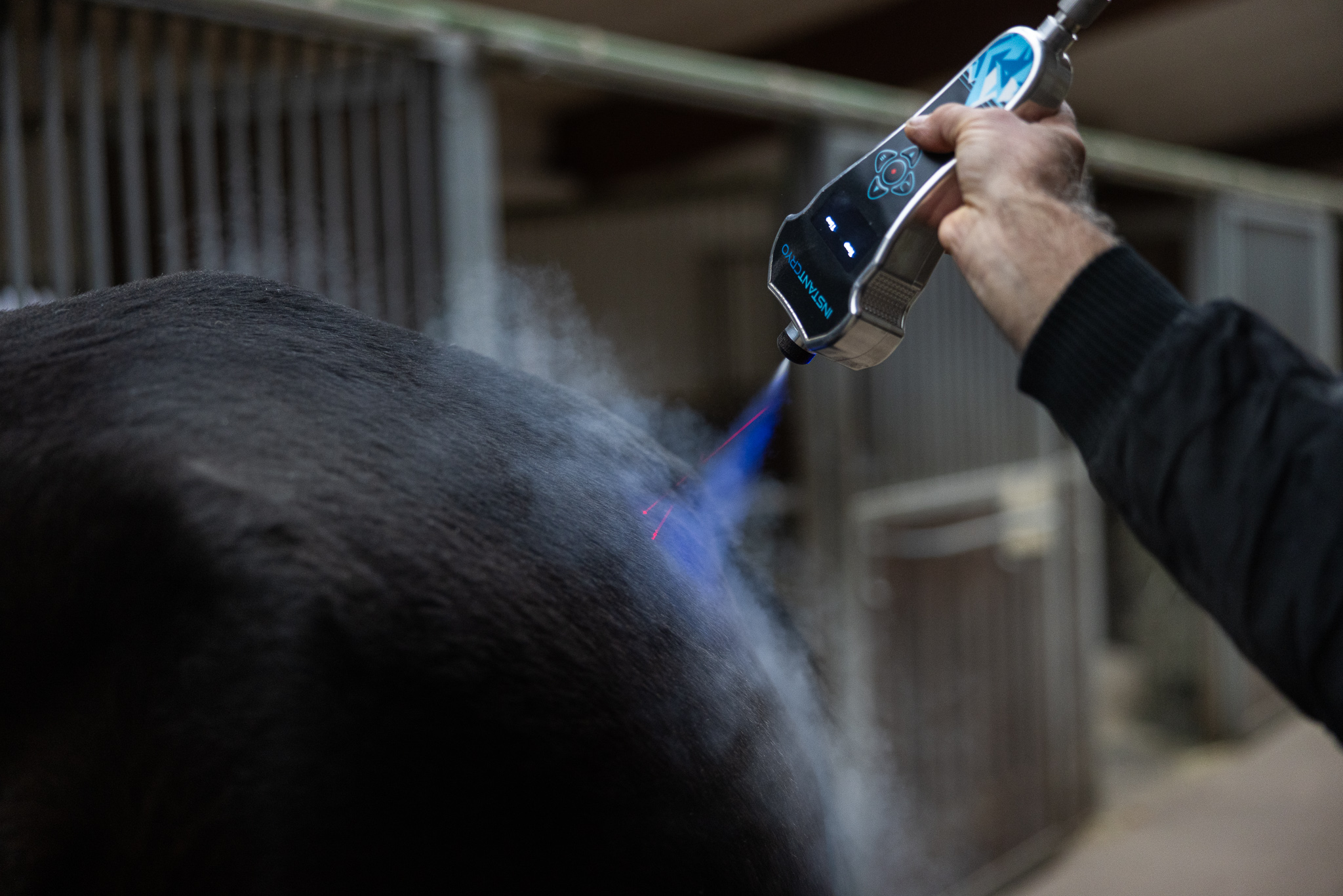 Mit INSTANTCRYO™ wird flüssiges CO2 bei -78 °C und 50 bar Druck punktgenau auf die betroffenen Stellen appliziert. Durch diese Kombination aus extremer Kälte und hohem Druck wird die Oberflächentemperatur der Haut innerhalb von Sekunden auf ein therapeutisches Niveau gesenkt. Dein Pferd kann sich während der Behandlung entspannen, ohne Stress und in ruhiger Atmosphäre.